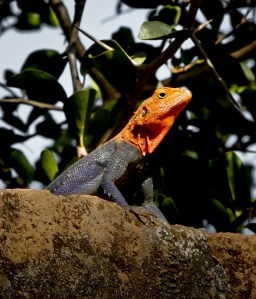 Red-headed rock agama (Agama agama) climbing on the wall of Plan International office in the centre of Lira town, northern Uganda.