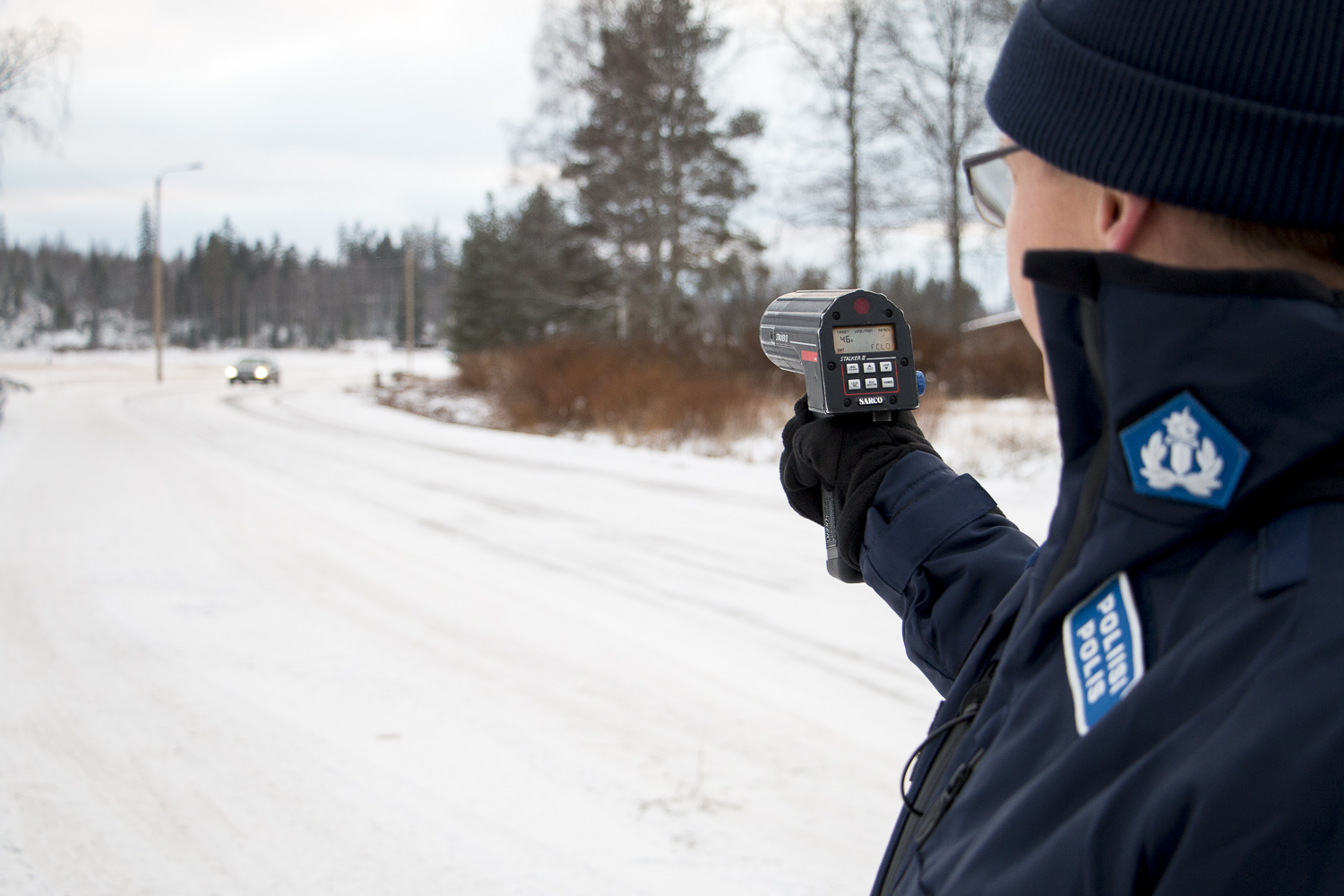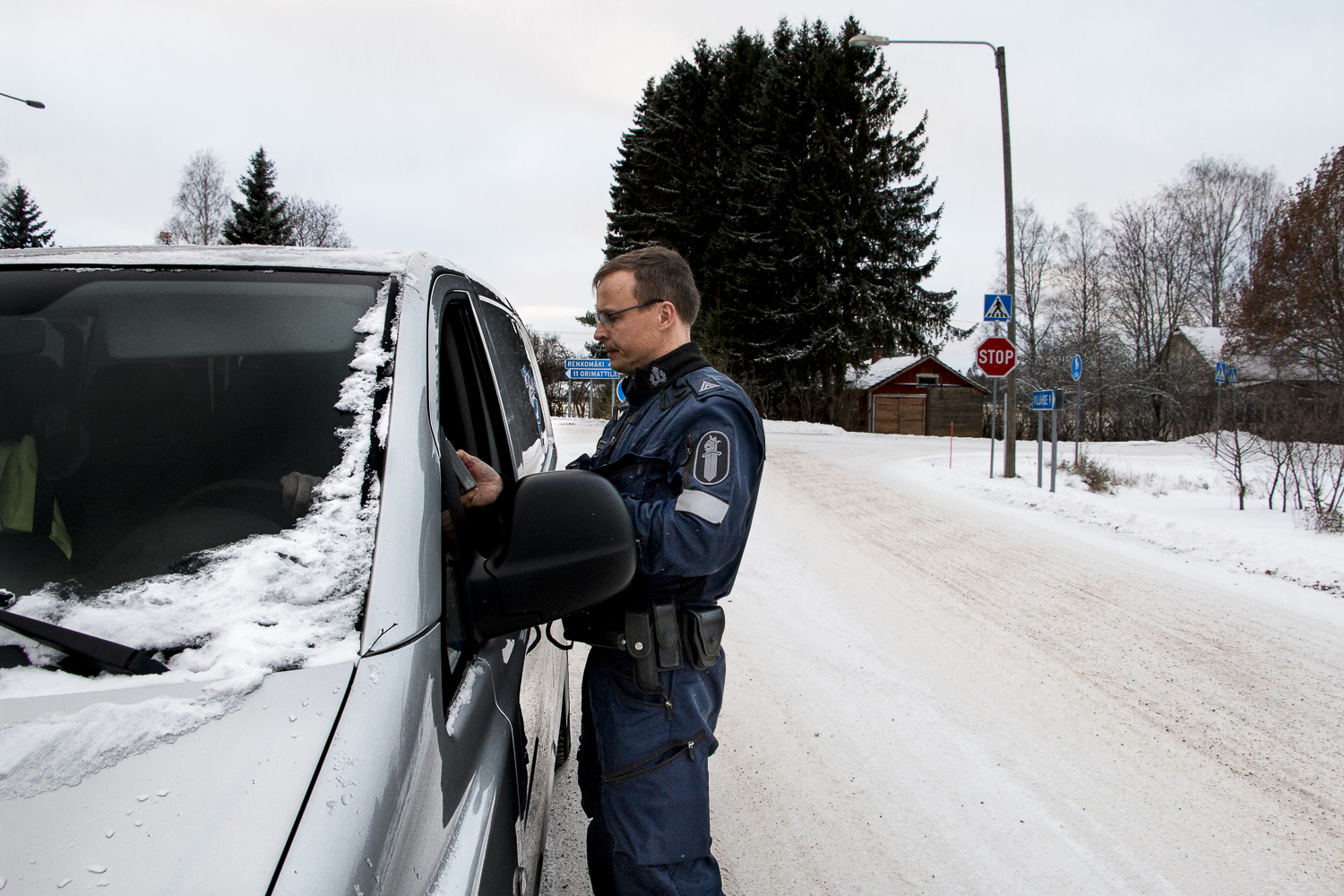 Ensimmäinen kohde on Orimattilan Pennalan taajama. Aluksi tarkistetaan 40 kilometrin aluerajoituksen merkit, että ne eivät ole lumen peitossa. Pihasta poliisiauton perään kurvaa pakettiauto.