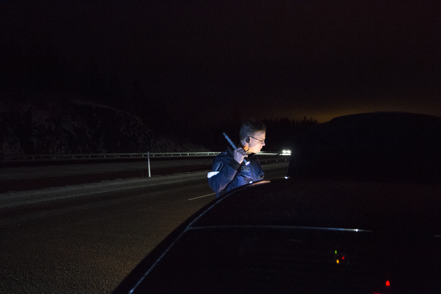 ”Huikkaa Pönälle, että meille tuli asiakas”, Molander sanoo ja kytkee vilkut päälle. Miettinen ottaa poliisiradiolla yhteyden Pöntiseen, joka on suorittamassa rekkaratsiaa.